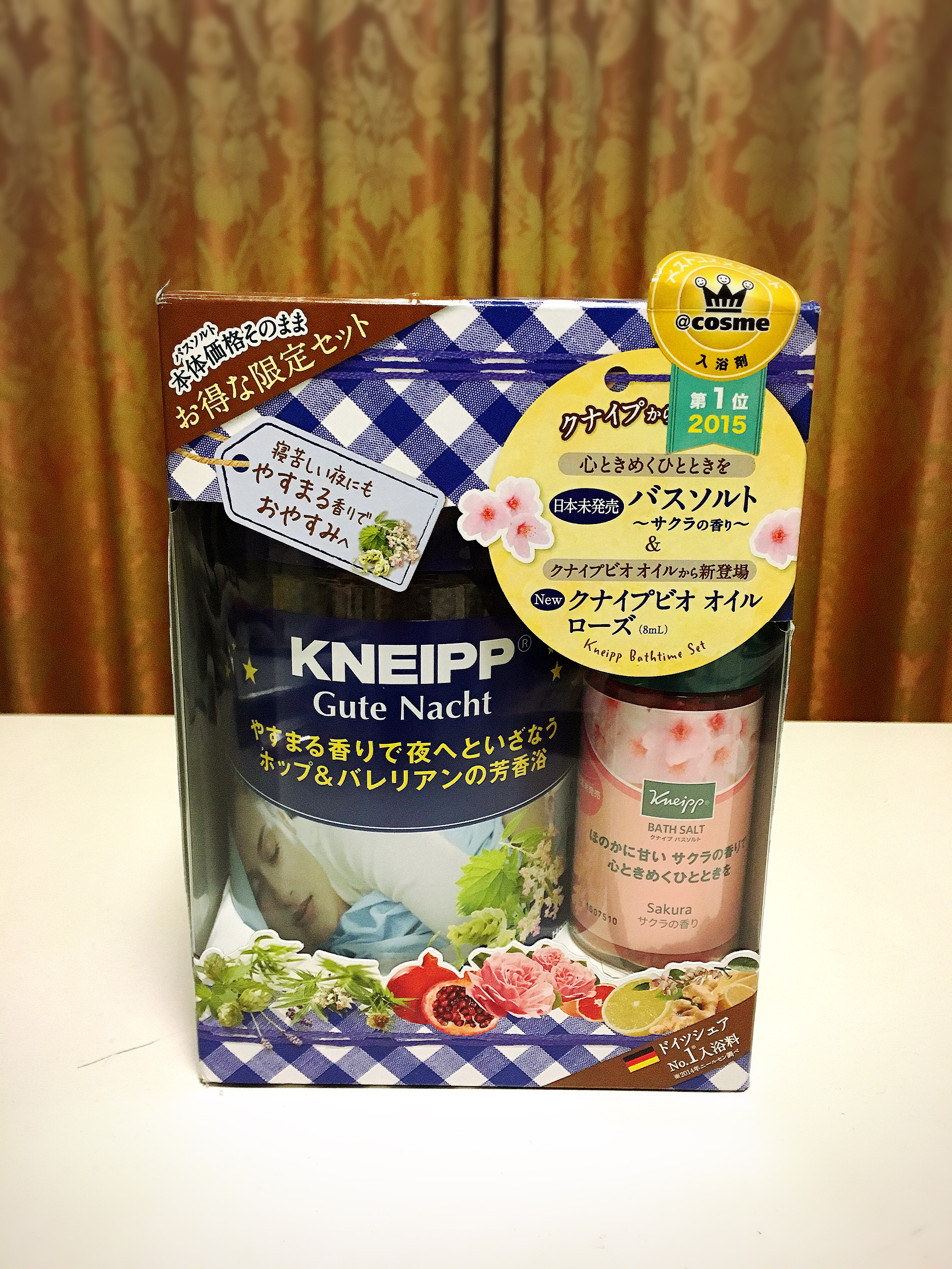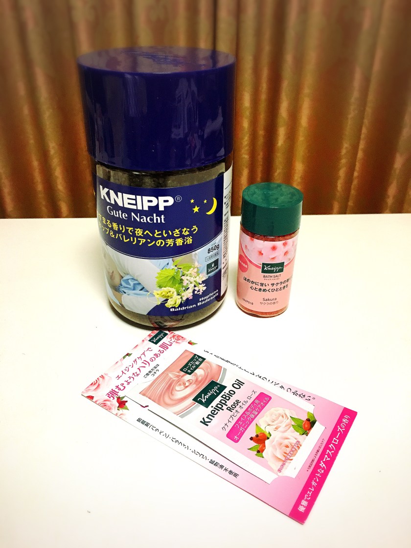 The package includes a small bottle of Sakura bath salts which is not available in the Japan market and rose organic moisturizing oil for the price of one KNEIPP.