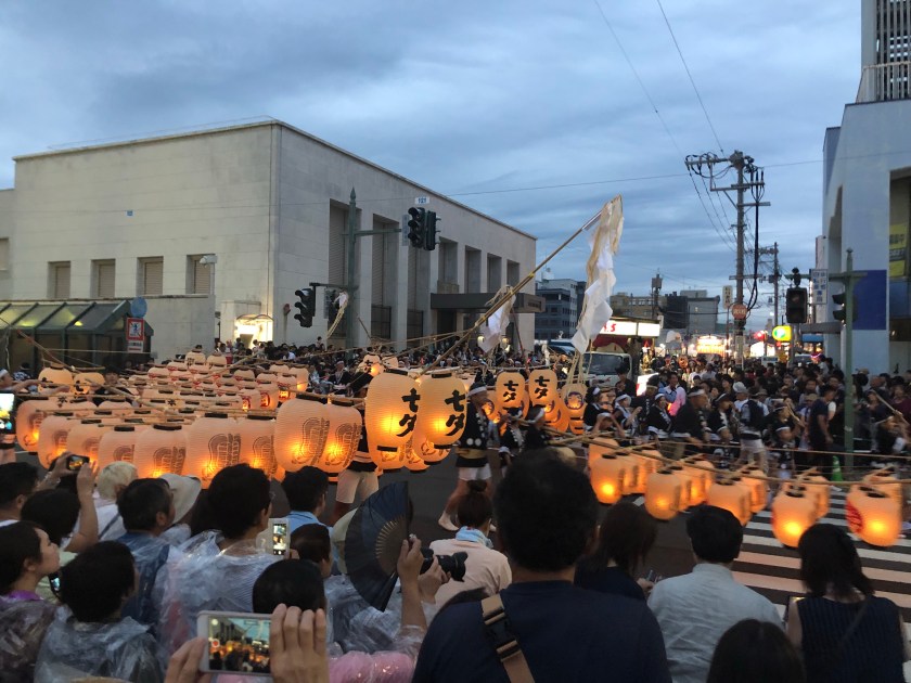 It’s an amazing festival with sound of taiko, fue and Kanto (Lanterns on Bamboos).