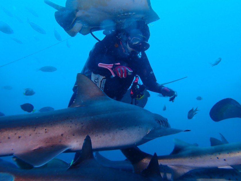 To my surprise there are many sharks swimming under a group of Moorish Idols.
